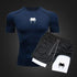 Men's compression athletic set featuring quick-dry polyester construction with digital-printed design. Short-sleeve top paired with drawstring shorts, engineered for everyday wear and warm-weather performance. True-to-size fit with knit fabric for comfort and durability. Ideal for training, casual activity, or layering.