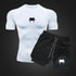 Men's compression athletic set featuring quick-dry polyester construction with digital-printed design. Short-sleeve top paired with drawstring shorts, engineered for everyday wear and warm-weather performance. True-to-size fit with knit fabric for comfort and durability. Ideal for training, casual activity, or layering.