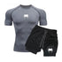 Men's compression athletic set featuring quick-dry polyester construction with digital-printed design. Short-sleeve top paired with drawstring shorts, engineered for everyday wear and warm-weather performance. True-to-size fit with knit fabric for comfort and durability. Ideal for training, casual activity, or layering.